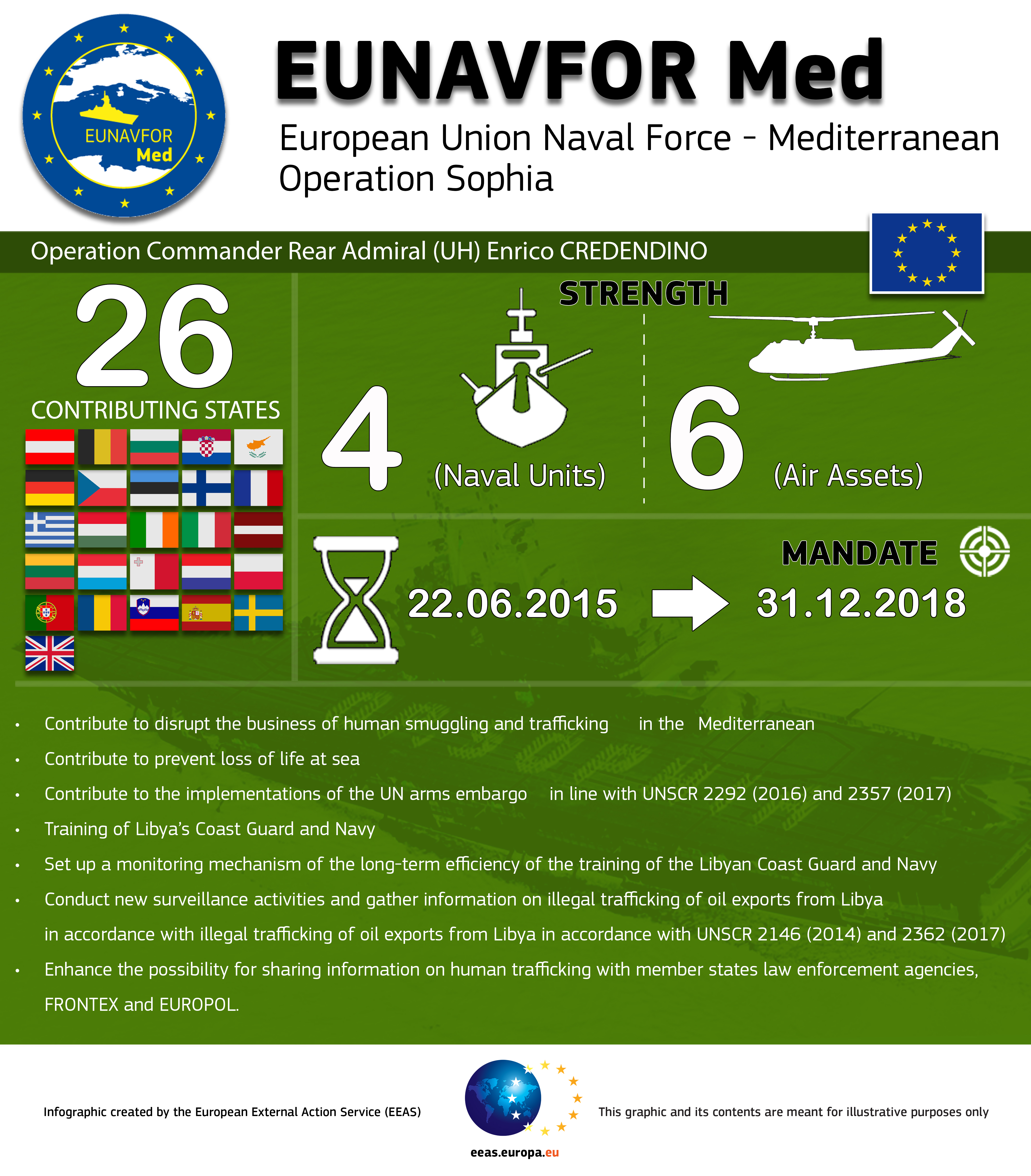 The European Council is responsible for assessing whether the conditions for transition between the operation phases have been met. On the legal side, all of the activities undertaken in each phase adhere to and respect international law, including human rights, humanitarian and refugee law and the “non-refoulement” principle meaning that no rescued persons can be disembarked in a third country.
