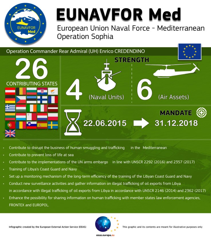 As part of this, the other EU member states agreed to strengthen the EU’s ’presence at sea, to fight the traffickers, to prevent illegal migration flows and to reinforce internal solidarity and responsibility’. The EU also made the decision to initiate a Common Foreign and Security Policy’s (CSDP) crisis management operation within the framework of the EU’s Maritime Security Strategy. Originally referred to as EUNAVFOR MED, the operation was later renamed ‘Sophia’ at the proposal of the High Representative Federica Mogherini after a baby born on board of one of the ships participating in the operation.