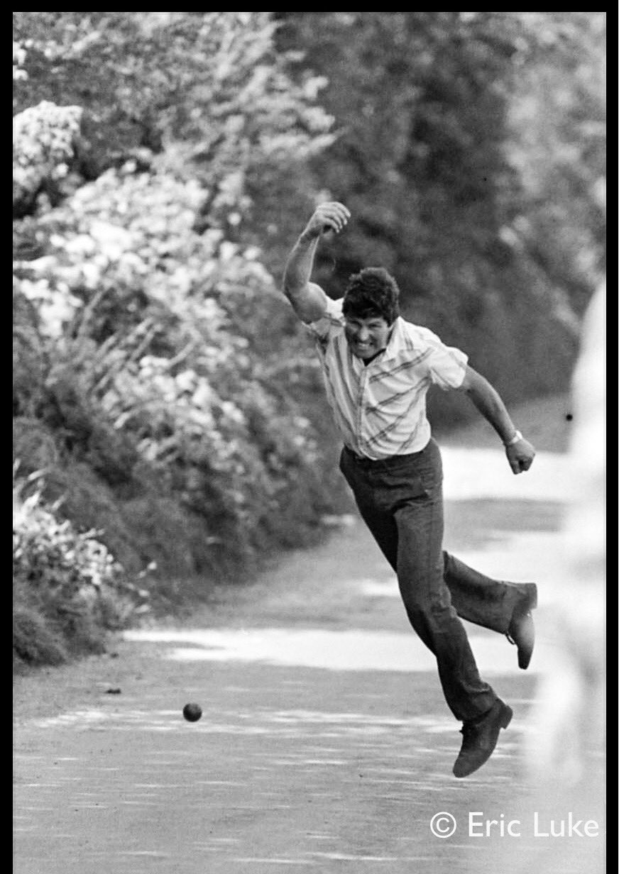 This photograph is of Owen Hughes from Lankill, near Westport competing in the sport of road bowling. It is was taken by Eric Luke, and I use it at his kind permission.