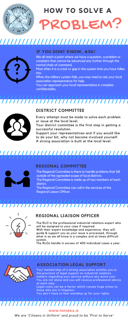 The membership of each District elect a District Committee – the size of this committee varies in size between 5 and 12 members. Each District Committee is elected by secret ballot of district members every three years. This District Committee holds regular meetings with the Barrack Commander to discuss matters of concern that fall within the ‘Scope of Representation’ for this level. Every attempt is made to have these issues resolved by agreement. The District Committee Representative is your initial access to the representative process. If you have a complaint or concern with your employment or indeed with the association the District Representative will attempt through the District Committee to have the matter resolved to your satisfaction.