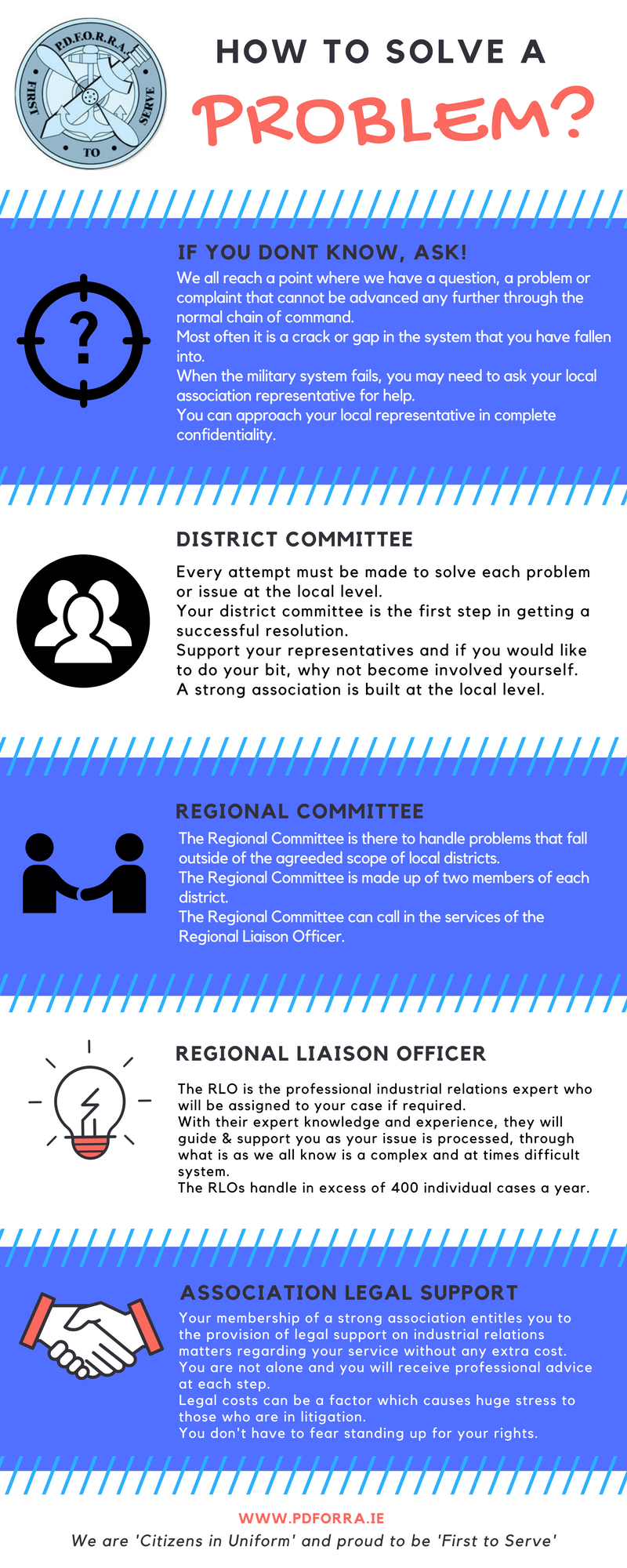 PDFORRA members are spread throughout the Defence Forces and operate under various local and service conditions. The Association is organised in such a way that specific concerns of particular groups of members can be represented effectively while at the same time providing an overall framework that allows the Association to act collectively to bring its full influence to bear on vital issues.